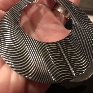 Lightweight probably aluminum metal earrings with ridged wavy lines in them.