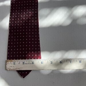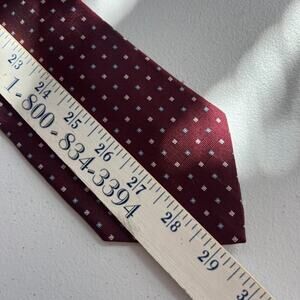 This product is a dark red square patterned men's tie made from 100% pure silk by Brooks Brothers. The tie features a geometric design, a logo accent, and is adjustable. It is a luxury, designer accessory perfect for a date night or dinner party, with a preppy and sophisticated theme. The tie is woven in the United States and has a width of 3.75 inches and a length of 58 inches, making it a versatile and stylish addition to any man's wardrobe.