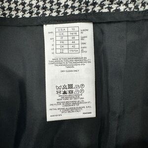 This beautiful pencil skirt by Brooks Brothers is a must-have addition to your wardrobe. The classic black and white houndstooth pattern gives it a timeless look that is perfect for any occasion, whether it's casual or formal. The skirt has a button up front and is made from a knit fabric type that is both comfortable and durable. The skirt is knee-length and has a pencil style, which is flattering on any body type. It is made from a blend of polyester, viscose, acetate, and wool, and can be dry cleaned only. The skirt is lined and has accents of button front that add an extra touch of elegance. This skirt is perfect for the winter, summer, fall, or spring, making it a versatile addition to your wardrobe.
