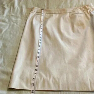 346 Brooks Brothers Stretch Khaki Beige Midi Skirt in Size 14. Fully lined with front pockets & small slit in the front. Great pre owned condition. Great classic business, preppy skirt.