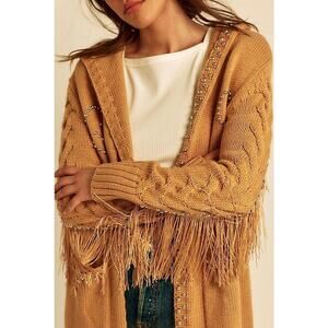 This maxi length cardigan from Understated Leather features knit fabrication, long sleeves with cable-knit details and fringe trim, an attached hood, patch pockets, and dome studs.