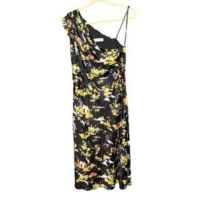 Ieena by Mac Duggal Multi Floral Sleeveless Midi Dress Style No. 55630. Asymmetrical One Side Shoulder Floral Printed Fit and Flare Midi Dress in black charmeuse. Show off a chic wardrobe in this beautiful dress in vibrant colors and floral prints. The sleeveless bodice shows an asymmetrical neckline with one side shoulder. The midi length fit and flare silhouette flourishes in a full-length hem.