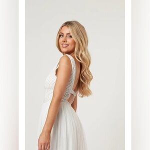 White wedding dress embellished top with sequin and pearl beading and finished with a lined tulle flowy skirt. Plunging v neckline front showcasing the cinched waistline with the beaded band to give an ultra-flattering look. Low backline with open back detailing. This a-line beaded wedding dress is the perfect choice for you if you are looking for an elegant look. An affordable wedding dress that will have you looking great!
