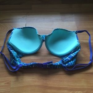 Lightly lined bra. Used, but lots of life left to it! Extremely comfortable band with a smooth overlay featuring blue accents. Loved this bra, but not the right size for me!
