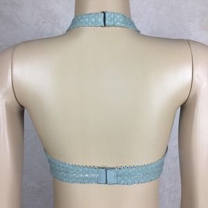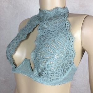 Green crochet lace, unlined demi, high neck bra from the Dream Angels line by Victoria’s Secret. This stunning style has halter style closure behind neck and back closure lower. Peekaboo center with underwire support in a sexy unlined cup. This style has been discontinued by Victoria’s and will soon be impossible to find.