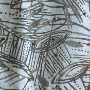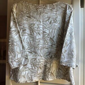This top transitions from summer to fall with its neutral, nature-inspired pattern and wood-beaded embellishments. Surprise! Some of the beads are gold for a subtle sparkle. The top is 22" from neck to hem, so it's also works well for folks who wear Petite XL/XLP. 95% Cotton, 5% Spandex for a little stretch. Excellent condition!