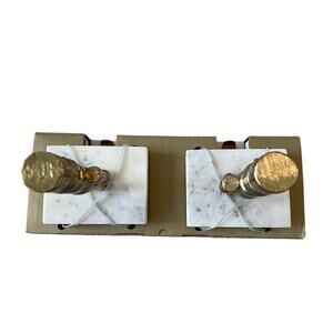 set includes 2 stocking holders, marble base, holiday theme, gold tone hardware