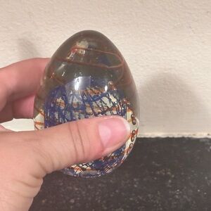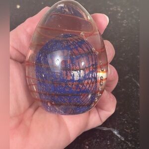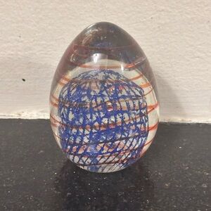 3.5" Egg Shaped Hand Blown Art Glass PAPERWEIGHT Red Spiral Blue Lattice Heavy