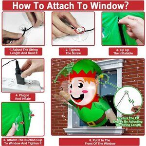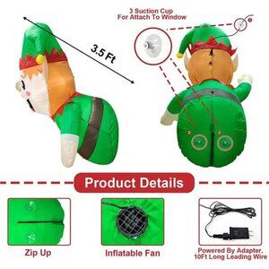 -[ 3.5 Ft Inflatable Elf Lean Out from Window ] 3.5 Ft tall Christmas inflatable green Elf with unique design lean out from window. Package includes a blow up inflatable, screw sucker, tether, built-in fan and a plug with UL certification. Copyright Certificated Model.