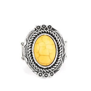 A sunny yellow stone is pressed into an antiqued silver frame radiating with floral detail for a seasonal look. Features a stretchy band for a flexible fit.