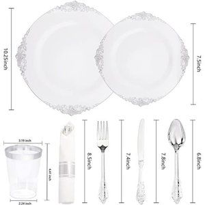 🧿🍽【CATERING FOR UP TO 50 GUESTS】This silver disposable plates set includes 50 dessert plates , 50 dinner plates, 50 knives, 50forks, 50spoons, 50cups and 50 napkins. These disposable silver plastic plates are perfect for a gathering of fifty people. Elegant disposable plates for weddings are sure to be a hit with your guests.