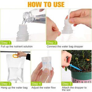 Easy to Install - the top of the durable plant IV water bag is designed with a handle, you can easily hang the bag on a high hook; Just fill the water bag with fresh water, hang or place the water bag in a higher place, insert the watering spike into soil and adjust the flow valve to control the water flow speed, then the automatic watering device will start to work; They help you water the deep roots of plants and make irrigation more efficient