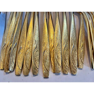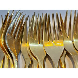 12 forks (have the most wear to gold) 10 teaspoons (mild wear to gold), ladle (looks great) 3 table spoons (mild wear) 9 knives (Moderate wear to gold)