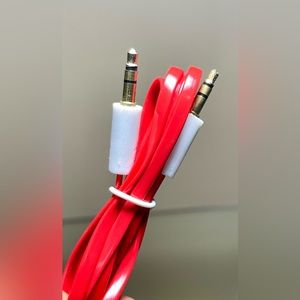 Tangle free flat wired aux cable with 3.5mm connectors. Color: orange, red, white, purple, pink.