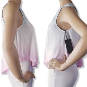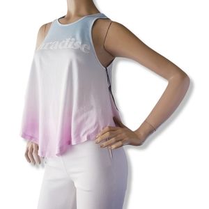 Lightweight and soft Ombre knit tank top. Colors are pink, white & and blue with "Paradise" print in the center. Longer in the middle (both front and back). Relaxed and with stretch.