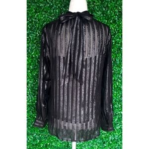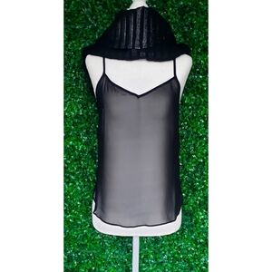 Party on top! The are special touches on this mockneck, like the cool tie at the back of the neck, the subtle sheer stripes, and the silky, drapey fabric. Also, it comes with a removable camisole for a little extra coverage. Write me with any questions!