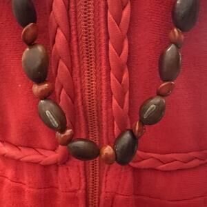 This vintage necklace features wooden beads in shades of orange/red, and brown, with a length of 36 inches. The necklace is nickel-free and stackable, and can be paired with any occasion. The necklace is a fashion piece from the 1990s, with a beaded chain type that adds a touch of bohemian flair to any outfit. It is a unique, original item that is perfect for those who love vintage jewelry.