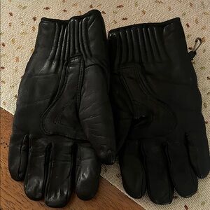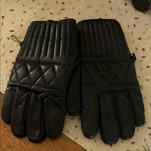 Stay warm and stylish with these black quilted leather gloves. Perfect for any occasion. Obermeyer brand. Unsure of size. Looks like a women’s small or medium. Used condition.