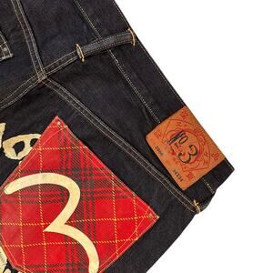 36” Waist x 34" Length Evisu 2000 Plaid Painted Gulls Dark Wash Denim