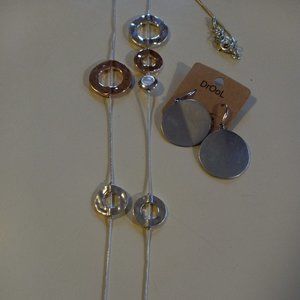 36 " chain silver necklace with silver, white, & rose gold circle accents & silver circle dangle earrings.