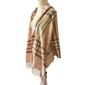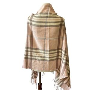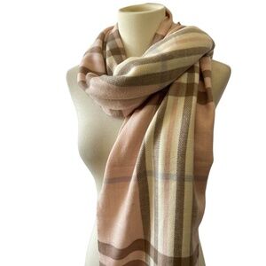 360 CASHMERE SCARF PINK TAUPE PLAID FRINGE SPRINGTIME LAYERING COZY LUXURY CHIC