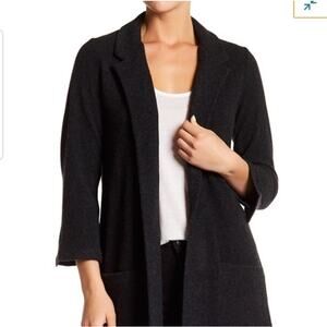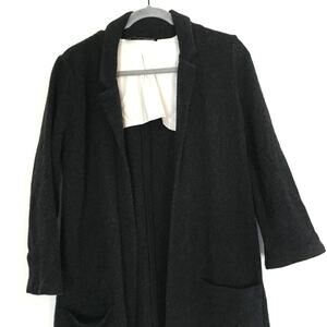 Features/Tags: wool blend, open front, pockets, collar with notched lapel, side slits, sleeves have slits, soft cozy fabric, only back of neck is lined, Italian yarn