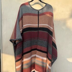 Cozy up in this chic 360 Cashmere oversized open-front cardigan/poncho. Features bold horizontal stripes in warm tones of burgundy, camel, grey, black, and cream. Made with a soft cashmere blend, it drapes beautifully with wide short sleeves, a relaxed silhouette, and fringe trim along the hem for a bohemian touch.