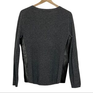 Mixed texture luxe pullover. Charcoal heather grey wool/cashmere blend lightweight knit sweater. Ribbed back torso and back sleeves. Smooth black leather colorblock vertical side panels. Round neck. Long sleeves. Good condition. Size large.