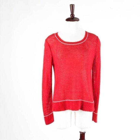 EUC 360 Cashmere red linen knit sweater. White trim. 100% linen.