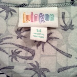 LulaRoe High/Low Scoop Neck Short Sleeve Tunic Tee Women's 14 All Over Palm Tree Print. Navy/White/Gray 95% Poly, 5% Spandex. Excellent Preowned Condition. Wash Cold, Hand Dry.