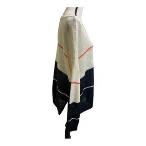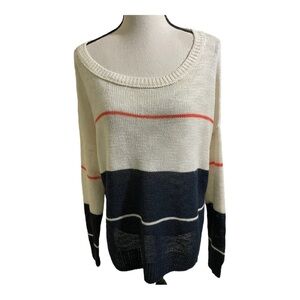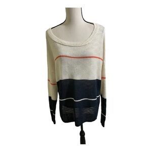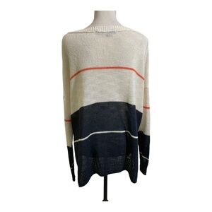 360 Sweater striped knit round neckline. Has Flaw. Small hole in back on the dark blue section. See photos for hole size. It’s oversized size Small.