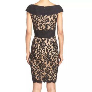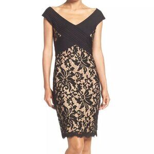$360 TADASHI SHOJI Off the Shoulder JERSEY Lace Sheath DRESS BLACK NUDE 4
