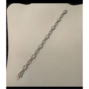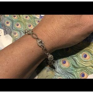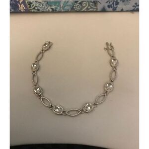 This tennis bracelet is gorgeous. It features seven oval cut genuine white sapphire gemstones that are framed by smaller round cut stones for a pretty halo design. The seven oval,stones are 6x4 mm. The oval stones are alternated by open marquise shaped links that are studded with pave set stones. It is 7.5” in length and has a hidden secure box insert clasp and hook closure.