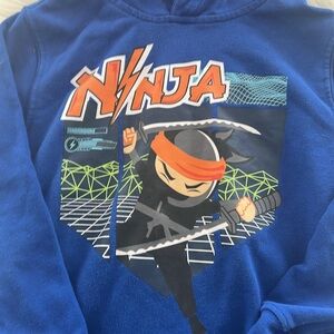 This is a size 7 blue hoodie sweatshirt that says ninja on the front. 60% cotton 40% polyester.
