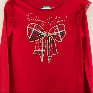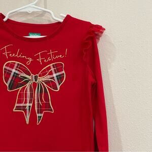 365 Kids Garanimals Red Long Sleeve "Feeling Festive" Plaid Bow Graphic Tulle Ruffle Sleeve Detail Holiday Christmas Top - Size 6