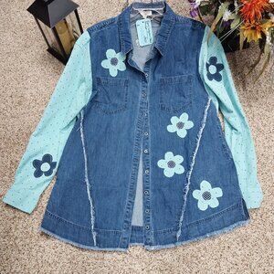 3655 Size Small Easel Upcycled Jean Shacket In Teal and Blue. NWT. Pit to pit 24" length 33" sleeve 24".
