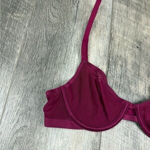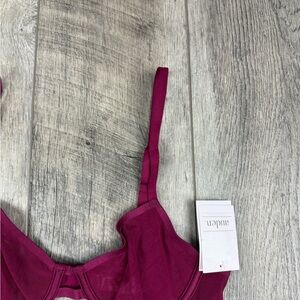 New with tags. Maroon colored sheer mesh material. Underwire with unlined cups. Clasps in the back. Small cutout section between cups. Various sizes available.