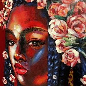 36x 24 canvas painting of woman with long braids wearing a floral crown.