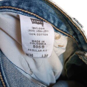 These Levi's 505 jeans offer a classic regular fit with a vintage distressed style. Crafted with durable denim, they feature a timeless blue wash.