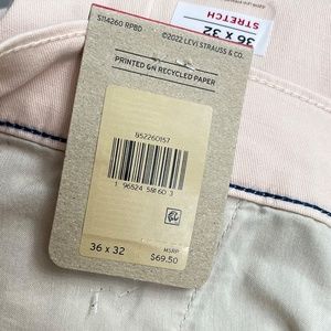 Levi’s Men’s XX Chino Standard Taper Pant. Style #85226-0157 Color: Light pink with a peachy undertone. Flat front. Zip fly with plastic button closure. Belt loops. Slash hand pockets (one has a hidden zipper pocket). Two rear welt pockets. Sits below the waist. Regular fit through seat and thigh. Slightly roomier than Levi’s Slim Taper fit. Garment-dyed for a vintage look and lived-in feel. Stretch woven fabric: 98% cotton, 2% elastane. Machine wash cold. Tumble dry.