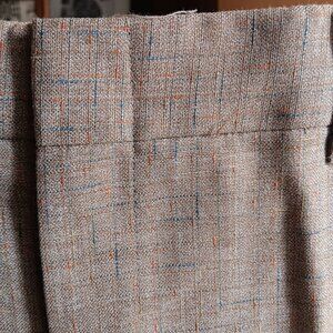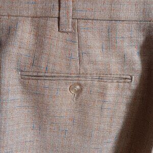 These vintage beige tweed pants evoke a timeless elegance with their subtle blue and orange check pattern. Featuring a classic flat front design, buttoned back pockets, and a secure zip fly, they are a refined choice for formal or casual wear. A distinguished addition to a vintage-inspired wardrobe.