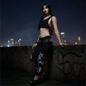 These low‑rise skinnies feature an inverted cross zipper at the fly & bold goth graphics up both legs: bones on one side & “Flesh & Blood” etched along the other in script that cuts deep.