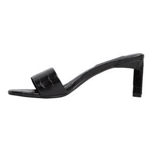open toe, kitten heels, squared off toe, Ebony black, Wide strap to vamp, Slip-on design, 6.8cm self-covered heel