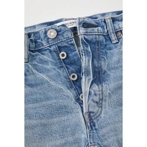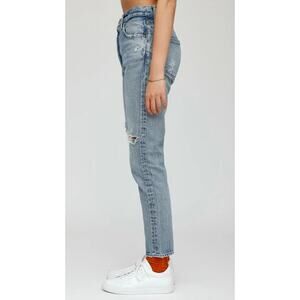 These size 24 high-rise, boyfriend cut, denim jeans are distressed above the knee. Button fly. Additional distressing at pockets and hems.