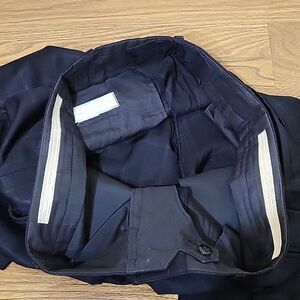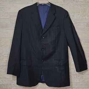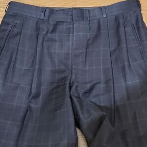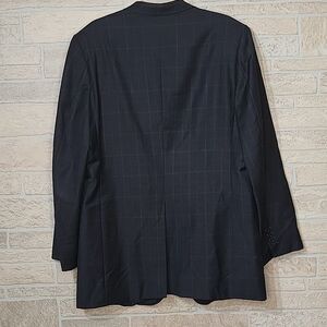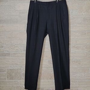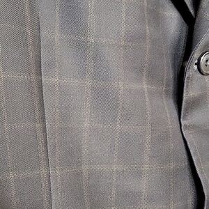 If you know, you know. This exceptional suit by Dormeuil is luxurious. Custom made, please pay attention to the measurements. Padded shoulder, 3 button front. Single pleat front pant narrows to the ankle. Windowpane weave. Dark Navy Blue with a light tan windowpane. Quality at its finest. Excellent condition with no issues.
