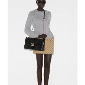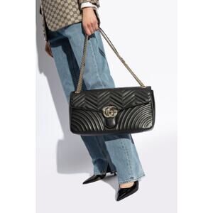 The GG Marmont collection spotlights sophisticated leather in dark tones to welcome Pre-Fall. Crafted in chevron patent leather, this shoulder bag underlines its contemporary silhouette in black, complete with light gold toned hardware.