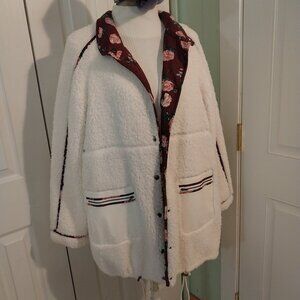 3748 1X Quilted Long Bog Coat In Green and Pink Print. Pit to pit 28" length 44" sleeve from the shoulder 19".