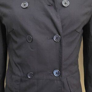 $3750 BELVEST DOUBLE BREASTED NAVY BLUE JACKET IN A MARKED SIZE 40- FITS A U;S 4/6. FEATURES CUFF STRAPS, Epaulettes AT EITHER SHOULDER, BUTTON CLOSURE WITH A HIDDEN SNAP FEATURE AT THE BOTTOM FOR A SNUG FIT.