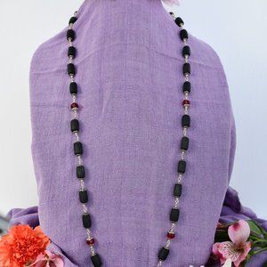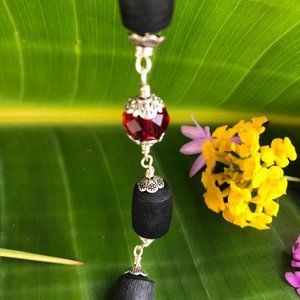 38 3/4" black Tulasi with red crystal glass beads