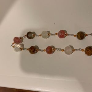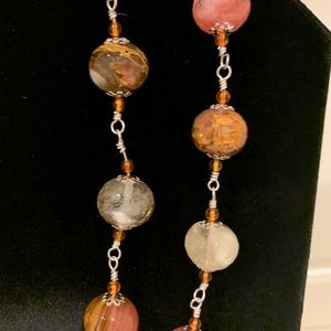 36" Necklace of faceted quartz beads of pink, brown and white wired with sterling silver findings and natural amber accent beads. Can be worn as single or double strand. Stunning unique handmade design really sparkles.
